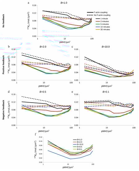 On the other hand, decreasing the binding coefficient, B = 0.5 and 0.1 (Figure 6d,e and Figure S2d,e), and therefore receiving a negative feedback from the F-actin foci did not alter the qualitative behavior or the minimum cell KD value when compared to the case of B = 1.0 (Figure 6a and Figure S2a). This happened because already formed TCR–pMHC complexes did not affect the binding probability of further TCR–pMHC complexes, resulting in a situation resembling the case of B = 1.0. Finally, Figure 6f (red and blue lines) shows how positive feedback affected the cell KD value while negative feedback (Figure 6f; green and orange lines) yielded cell KD values barely different compared to those where feedback was absent (B = 1.0; Figure 6f; black line).