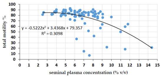 Sperm motility in relation to the concentration of seminal plasma in the semen dose. Pearson’s correlation (r = −0.52, p < 0.0001) between sperm motility at 144 h of storage and the concentration of seminal plasma in uncentrifuged semen portions extended to 18 × 106 sperm/mL in 100 mL volume; n = 87 semen samples from 19 different boars.