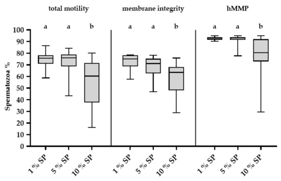 Sperm quality after 144 h of storage in semen doses containing different concentrations of seminal plasma (SP). Box-whisker plots showing variation in the total motility (%), membrane intact (% propidium iodide negative and peanut agglutinin (PNA) negative) sperm (%), and viable sperm (%) with high mitochondrial membrane potential (hMMP) (propidium iodide negative sperm with J-aggregates). Semen samples contain three different final concentrations of autologous SP: 1%, 5% and 10% (v/v). Different letters indicate significant difference (p < 0.01).