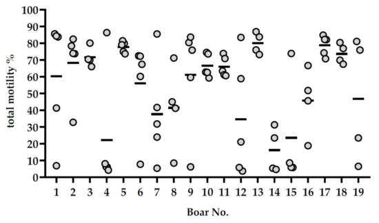 Sperm motility after 144 h of storage in single semen doses containing 10% (v/v) seminal plasma. Scatterplot showing the total motility (%) of semen samples with 10% autologous seminal plasma collected from 19 boars (n = 4–5 ejaculates per boar). Dots show the values measured in each sample and the bars show the mean for each boar.