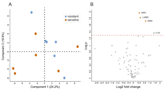 LC-MS/MS analysis of SP (n = 6 from resistant samples and n = 6 from sensitive samples) led to the quantification of 230 proteins at a false discovery rate < 1%. The principal component analysis (PCA) showed no distinct separation between ejaculates of long-term stored resistant and sensitive samples (Figure 5A). However, the volcano plot analysis (Figure 5B) and Students t-tests (Figure 6) revealed three proteins to be significantly altered in abundance. In particular, granulin precursor (GRN) (log2-fold change = 0.9; p-value = 0.02), legumain (LGMN; log2-fold change = 0.54; p-value = 0.01) and AWN (log2-fold change = 0.45; p-value = 0.01) were less abundant in SP-resistant compared to SP-sensitive samples.