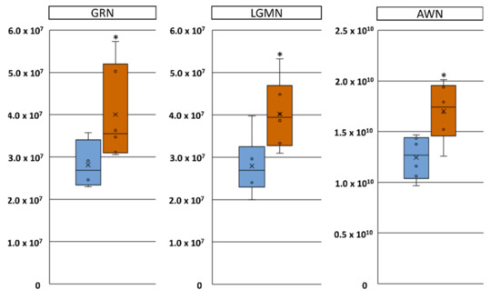 Proteins being significantly altered in abundance in seminal plasma of boars showing high sperm quality (resistant) and low sperm quality (sensitive) in stored semen doses containing 10% (v/v) autologous seminal plasma. Box plots of granulin (GRN), legumain (LGMN) and AWN intensity values in seminal plasma samples collected from ejaculates with resistant (blue boxes) and sensitive (orange boxes) sperm. * p < 0.05.