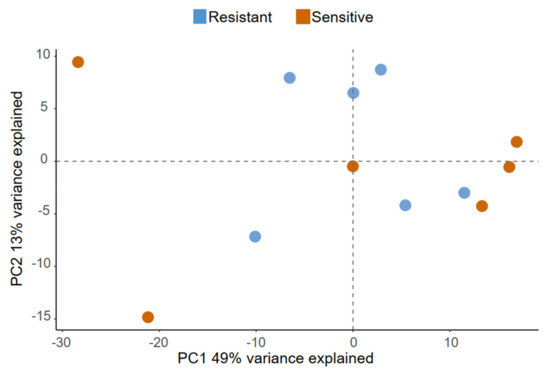 Exploratory data analysis of lipids identified in seminal plasma. Principal component analysis (PCA) showing how seminal plasma samples map onto principal components 1 and 2, which together contribute to explain 62% of the variance contained in the dataset. There is no distinct separation between samples collected from ejaculates with resistant (blue dots) and sensitive (orange dots) sperm to 10% (v/v) autologous seminal plasma in extended semen at 144 h of storage.