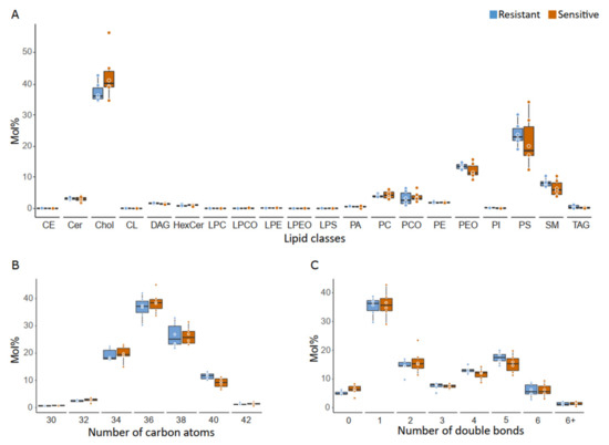 Lipid classes detected in seminal plasma, and profiles of total acyl chain length and unsaturation of nonstorage lipids. The mol% amounts of the different lipid features are presented as boxplots with dots. Each dot indicates a sample (n = 6 in each group). Values did not differ between sensitive and resistant samples (p > 0.05). (A) Lipid class composition. Mol% abundance of lipid classes in seminal plasma samples collected from ejaculates with resistant (blue bars) and sensitive (orange bars) sperm to 10% (v/v) autologous seminal plasma in extended semen at 144 h of storage. Prevalent lipid classes are cholesterol (Chol) and phosphatydilserine (PS). Classes appear in alphabetical order. The mole percent was calculated for all lipids. (B) Total acyl chain length profile. Lipids were regrouped according to the number of carbon atoms present in their acyl chains. The mole percent was calculated for sphingolipids, glycerophospholipids and diacylglycerides. Only length groups with a mean >1 mol l% are shown. Shorter chain lipids (lipids with 32 carbon atoms) are lowly abundant, as well as very long lipids (42 carbon atoms). The most represented group consists of lipids with 36 carbon atoms. (C) Unsaturation profile. Lipids were regrouped according to the number of double bonds present in their acyl chains. All species with more than six double bonds are indicated with “6+”. The mole percent was calculated for sphingolipids, glycerophospholipids and diacylglycerides. 0 = saturated lipids; 1 = mono-unsaturated lipids; 2 = di-unsaturated lipids; 3–6+ = poly-unsaturated lipids. Boar seminal plasma contains many mono-unsaturated phospho- and sphingolipids.