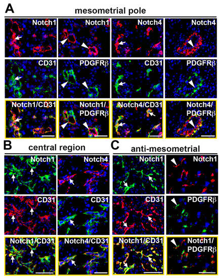 To determine expression of Notch proteins in the decidual vasculature, implantation sites were double stained with antibodies to detect Notch1 and Notch4 with respect to ECs and mural cells. In the mesometrial region, CD31+ capillary ECs at the mesometrial pole and in the central region express Notch1 and Notch4 (Figure 2A,B). In SpAs at the mesometrial pole, PDGFRβ+ mural cells are adjacent to ECs that express both Notch1 and Notch4 (Figure 2A). In the anti-mesometrial region, Notch1 is expressed in CD31+ ECs surrounded by Notch1 negative PDGFRβ+ mural cells (Figure 2C). Notch4 expression was not detected in the anti-mesometrial region (data not shown).