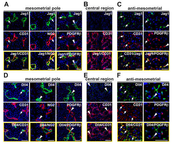 Expression of Notch ligands, Jag1 and Dll4, in the E7.5 decidual vasculature. High magnification images of sections double stained to detect expression of Jag1 or Dll4 and the endothelial cell marker, CD31 or mural cell marker, PDGFRβ. (A) In MP SpAs, Jag1 is expressed in CD31+ ECs (white arrow) and in NG2+ and PDGFRβ+ mural cells (white arrows). Some Jag1+ ECs are closely associated with PDGFRβ+/Jag1− mural cells (white arrowheads). (B) Expression of Jag1 is not detected in the central region. (C) In the AMR, expression of Jag1 is sparse. Jag1 is expressed in CD31+ ECs and PDGFRβ+ mural cells (white arrows). Jag1+ cells are closely associated with PDGFRβ+ mural cells (white arrowheads). (D) In MP SpAs, Dll4 is expressed in CD31+ ECs (white arrows). NG2+ and PDGFRβ+ mural cells are closely associated with Dll4+ cells (white arrowheads). (E) In the CTR, Dll4 is expressed in a punctate pattern (white arrowheads). (F) In the AMR, Dll4 is expressed in CD31+ ECs (white arrows). Dll4+ cells are associated with PDGFRβ+ mural cells (white arowheads). AMR = anti-mesometrial; CTR = central region; MP = mesometrial pole. Scale bars = 50 μm.