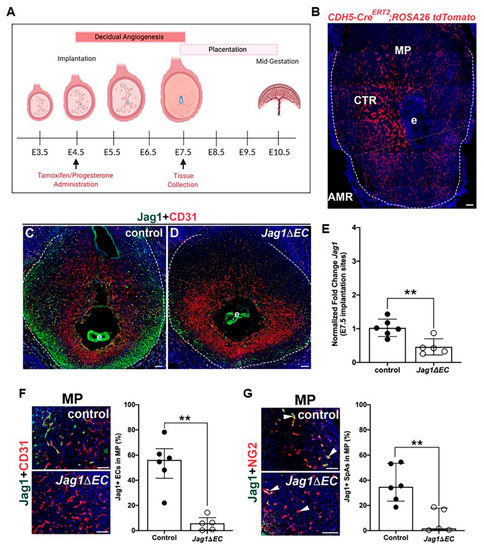 Tamoxifen-induced Cre recombination decreases expression of Jag1 in Cdh5-CreERT2;Jag1flox/flox (Jag1ΔEC) pregnancy. (A) Schematic of the mouse gestation timeline highlighting key processes involved, and experimental timeline (created with BioRender.com). At E4.5, tamoxifen is administered to induce Cre recombination and progesterone was administered to minimize secondary angiogenic defects in the uterus due to vascular defects in the ovaries. Pregnancies and uterine phenotype were assessed at E7.5. (B) Representative image of an implantation site at E7.5 from the Cdh5-CreERT2; ROSA26 tdTomato reporter. The decidua is within the dashed white. tdTomato expression, indicating Cre-induced recombination, is detected in a vascular pattern throughout the decidua. Dashed line denotes MR and AMR. (C,D) Representative images of implantation sites of Cdh5-CreERT2 control and Jag1ΔEC pregnancies stained for Jag1 and CD31. Expression of Jag1 is reduced in the decidua (outlined with dashed white lines), but not the embryo of Jag1ΔEC mutants. (E) qRT-PCR determination of Jag1 expression in implantation sites from control (n = 6) and Jag1ΔEC (n = 5) pregnancies. The relative expression level of Jag1 was compared to β-actin. Jag1 was significantly decreased in Jag1ΔEC mutants as compared to Cdh5-CreERT2 controls. (F) Representative images of the MP of control and Jag1ΔEC implantation sites double stained for EC marker CD31 and Jag1. At the MP, expression of Jag1 in all CD31+ ECs is reduced in Jag1ΔEC mutants (n = 6) as compared to Cdh5-CreERT2 controls (n = 5). (G) Representative images of the MP of control and Jag1ΔEC implantation sites double stained for Jag1 and NG2. Expression of Jag1 in the ECs of the NG2+ surrounded SpAs (white arrowheads) is reduced in Jag1ΔEC mutants (n = 5) as compared to Cdh5-CreERT2 controls (n = 6). AMR= anti-mesometrial region; CTR = central region; e = embryo; MP = mesometrial pole. Scale bars = 100 μm in (B–D,F,G). Data shown as median + IQR; ** p < 0.01.