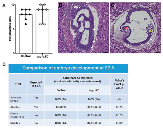 To determine if EC-specific loss of Jag1 impacts pregnancy and embryo development at E7.5, implantation sites were collected and counted, and embryo morphology was assessed in H&E stained sections. Litter size for Cdh5-CreERT2 control and Jag1ΔEC pregnancies is similar (Figure 5A). Embryo development involves the formation and disappearance of morphologic structures during gestation [46]. To determine embryo morphology with respect to embryonic age, all tissue sections containing embryos were scored for the presence or absence of the following morphologic structures: primitive streak, allantois, cranial neural fold and somites (Figure 5B,C). These morphologic “landmarks” are common to gastrulating wild-type embryos between E6.5 and E8.5, and the timing of their appearance is used to compare stage of embryo development. Comparison of Cdh5-CreERT2 control and Jag1ΔEC pregnancies revealed that embryos from Cdh5-CreERT2 control and Jag1ΔEC pregnancies progressed to a similar stage of development (Figure 5D).
