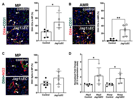 2.5. Expression of Notch Ligand, Dll4, and Notch Effectors Is Increased in Jag1∆EC Pregnancies at E7.5