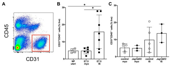 EC-specific loss of Jag1 does not impact the frequency of CD31+ ECs in implantation sites. (A) Representative dot plot of flow cytometry (FCM) data showing gating strategy to identify CD31+ CD45– EC populations in implantation sites from wild-type C57BL/6 mice at E7.5. (B) Results of FCM analysis to assess CD31+CD45− cell populations in uteri from nonpregnant C57BL/6 mice, and in the myometrium and implantation sites from pregnant C57BL/6 mice at E7.5. The percentage of CD31+CD45− ECs is significantly higher in implantation sites compared to the myometrium or nonpregnant uteri. (C) Results of FCM analysis to determine the percentage of CD31+CD45− ECs in the myometrium and implantation sites of Cdh5-CreERT2 control and Jag1ΔEC pregnancies at E7.5. The percentage of CD31+CD45− ECs in the myometrium and implantation sites of Cdh5-CreERT2 control and Jag1ΔEC pregnancies is similar. IS = implantation site; myo = myometrium; NP = nonpregnant; each group contains n = 3–5 individual mice. Data shown as median + IQR; * p < 0.05.