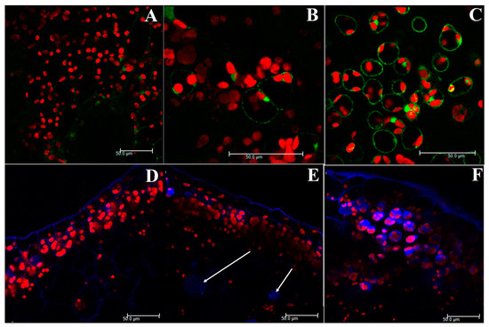 Furthermore, comparable red signals in all treated and control samples show a well-evident chlorophyll presence, even in the highest concentration-treated samples, suggesting a preserved photosynthesis.