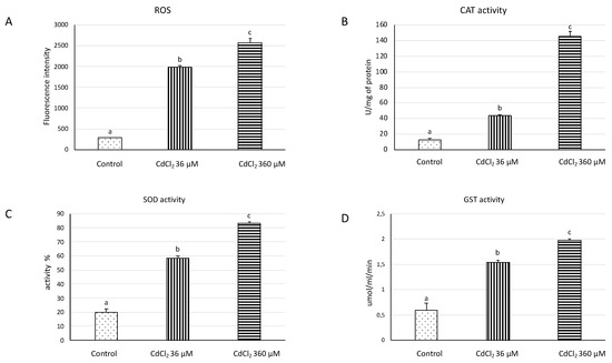 In Cd-treated samples, the amount of ROS highly increased compared to controls (Figure 2A), and the antioxidant/detoxifying enzymes under investigation were also progressively activated by the two Cd concentrations. Both ROS amount and enzyme activity are strongly related to its bioaccumulation (Table S1). Actually, CAT increased up to 145 U/mg for 360 µM-treated samples (Figure 2B), whereas, the activity of SOD in 360 µM-treated samples of cadmium is about 63% higher than the control, while in those treated with 36 µM there is an increase of about 25% compared to the control (Figure 2C). Both Cd concentrations markedly enhanced the GST activity, reaching a value of 2 µmol mL−1 min−1 in the 360 µM-treated samples (Figure 2D).