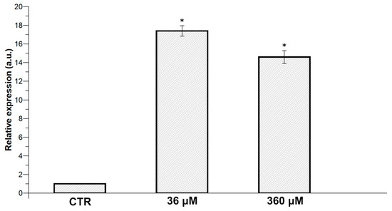 To evaluate the possible stress in C. conicum following to CdCl2 exposure, we analyzed, by RT-qPCR, the relative gene expression changes of the stress gene Hsp70, comparing the values obtained in unexposed and exposed samples. The results show an up-regulation of this gene in exposed samples since we observed an increase in the expression of Hsp70 for both exposure doses (36 and 360 µM CdCl2). In particular, as shown in Figure 3, the exposure to 36 µM and 360 µM CdCl2 produced increased Hsp70 expression ~17.4- and ~14.6-fold, respectively, relative to control condition (unexposed samples).