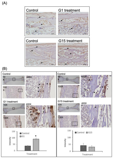 All animal experiments were approved by The Animal Care and Use Committee of Kaohsiung Medical University (IACUC Approval No. 102194, 26 March 2014). Two male and 4 female 8-week-old Sprague–Dawley rats (250–300 g) were purchased from BioLasco (Taiwan, China) and housed under standard laboratory conditions (24 °C, 12-h light–dark cycle) with ad libitum food and water. The rats were mated to breed neonatal rats. Furthermore, 4-day-old neonatal rats were scarified, and their tibiae were harvested. The tibiae were washed 3 times with antibiotics to avoid contamination; they were then cultured in BGJb medium containing 10% charcoal-striped serum (100 mL of FBS treated with 0.5 g of charcoal and 0.052 g of dextran T-70 for 2 h at 37 °C and then centrifuged at 12,000 rpm for 10 min), 0.5% antibiotics, and 10 μM BrdU. The control group included the left tibia (n ≥ 5), and the G-1 (500 nM) or G15 (15 µM) treatment group included the right tibia (n ≥ 5). After 7 days, the tibia was harvested and fixed with 10% neutral buffered formalin.