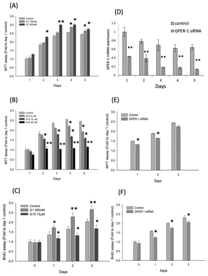 GPER-1 promotes cell viability and proliferation in D1 cells. (A,B) GPER-1 agonist, G-1, promotes the cell viability and GPER-1 antagonist, G-15, reduces the cell viability in D1 cells by MTT assay. (p < 0.05 compare with control group at each day). (C) The G-1 promotes cell proliferation and G-15 reduces the cell proliferation in D1 cells by BrdU assay. (D) The gene expression of GPER-1 was decreased after GPER-1 siRNA transfection. (E) The siRNA GPER-1 reduced the cell viability in D1 cells by MTT assay. (p < 0.05). (F) The siRNA GPER-1 reduces the cell proliferation in D1 cells by BrdU assay. (p < 0.05). (“*” p < 0.05; “**” p < 0.01; n = 4–6).
