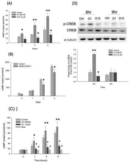 The GPER-1 regulates cAMP/PKA/p-CREB pathway. (A) The GPER-1 agonist, G-1, increases the cAMP content and the antagonist, G15, reduces the cAMP content. (B) The siRNA GPER-1 reduces the cAMP content in D1 cells. (* p < 0.05; ** p < 0.01; n = 4–6). (C) The cAMP inhibitor, Bupi, reduced the G-1 enhanced cAMP content. (* p < 0.05 and ** p < 0.01 compared with control group; # p < 0.05 compared with G1 treatment group.) (D) The protein levels of p-CREB was enhanced by G-1 treatment and reduced by G-15 treatment group. (* p < 0.05 and ** p < 0.01 compared with control group, n = 4–6).