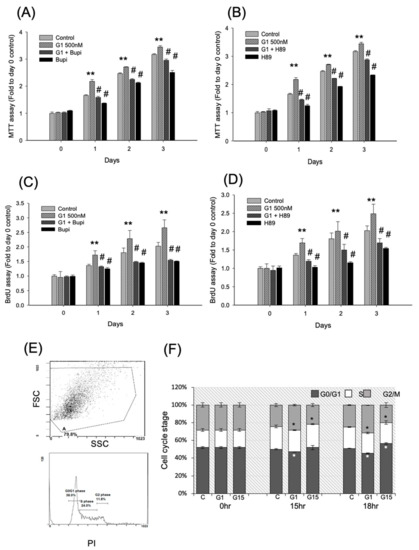 The GPER-1 promoted-cell viability and proliferation was reduced by cAMP inhibitor, Bupi, and PKA inhibitor, H-89. (A,B) The G-1-promoted cell viability was reduced by Bupi and H89 respectively by MTT assay. (** p < 0.01 compared with control group; # p < 0.05 compared with G-1 treatment group.) (C,D) The G-1-promoted cell proliferation was reduced by Bupi and H-89, respectively, by BrdU assay. (** p < 0.01 compared with control group; # p < 0.05 compared with G-1 treatment group.) (E) A representative flow gating strategy of flow cytometry for G-1 at 18hr. (F) After treatment of G-1 or G-15, the Cell cycle kinetics was detected by flow-cytometry. The results showed that GPER-1 agonist, G-1, reduced the ratio of G0/G1 phase and promoted cells to G2 phase (* p < 0.01 each phase of cell cycle in G-1 group compared with each phase in control group, ANOVA), but the GPER-1 agonist, G-15, reduced the ratio of G2 phase and arrest cell in G0/G1 phase (* p < 0.01 each phase of cell cycle in G-15 group compared with each phase in control group,).