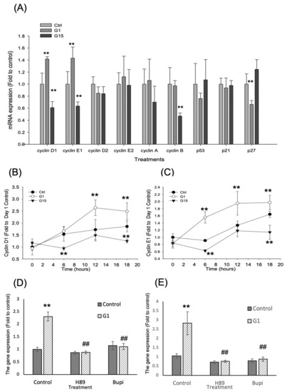 Because the activation of GPER-1 promotes the cell proliferation, we examined the expression of cell cycle regulators (Figure 5A). According to the results of mRNA expression, G-1 promoted the mRNA expression of cyclins D1 and E1 (p < 0.01, ANOVA), but G-15 reduced that mRNAs of cyclins D1, E1 and B after drug treatment for 12 h (p < 0.01, ANOVA). Furthermore, G-1 reduced the CDK inhibitor, p27kip1 (p < 0.01, ANOVA). However, the gene expression of cyclins D2, E2 and A; p53; and p21 did not vary significantly (Figure 5A).