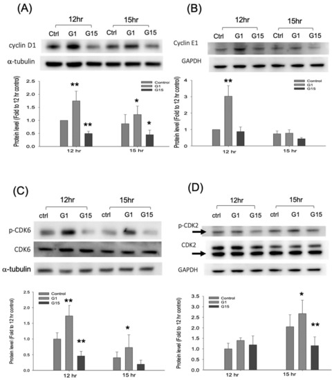 We further examined the protein levels of cyclins and CDKs. The results revealed that the protein levels of cyclins D1 and E1 were enhanced by G-1 but reduced by G-15 at 12 h (p < 0.01, ANOVA; (Figure 6A,B). The total CDK2 and CDK6 did not differ significantly between the treatments. However, p-CDK2 and p-CDK6 expression were increased by G-1 treatment (p < 0.01, ANOVA) but reduced by G-15 treatment (p < 0.01, ANOVA; Figure 6C,D). These data revealed that GPER-1 activation promoted the cell proliferation by enhancing the expression of cyclins D1 and E1, and further enhanced the phosphorylation of CDK2 and CDK6.