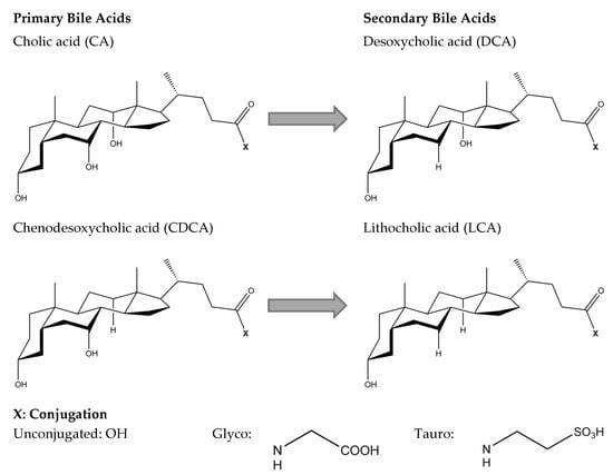 - Ridlon, J.M.; Kang, D.-J.; Hylemon, P.B. Bile salt biotransformations by human intestinal bacteria. J. Lipid Res. 2006, 47, 241–259. [Google Scholar] [CrossRef] [PubMed]