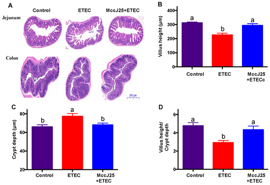 Villus morphology and histopathology of the jejunum and colon were assayed (Figure 5). As shown in Figure 5A, the morphology of the villi of the jejunum and colon in the control mice indicated that intestinal epithelial cells were arranged in an orderly fashion and had intact mucus layers. However, compared with the control, ETEC infection resulted in damage to mucosal morphology by increasing histopathology scores (Figure 5A,E,F) and induced lower villous height (V), lower V/C and higher crypt depth (C) in the jejunum compared to the control group (Figure 5B–D) (p < 0.05). Compared to ETE-infected mice, pretreated with MccJ25 significantly increased V and V/C and decreased C in the jejunum (p < 0.05). Furthermore, MccJ25 pretreatment inhibited ETEC-caused mucosal morphology damage in the jejunum and colon, with slight inflammatory morphology segment impairment persisting in the intestine (Figure 5E,F). In summary, the findings indicate that pretreated with MccJ25 relieved the intestinal inflammation induced by ETEC.