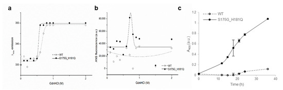 To investigate the stability differences between WT and S175G/H181Q mutant βB2-crystallins, we assessed red shift of intrinsic fluorescence changes by chemical denaturant GdnHCl in a dose dependent manner. As shown in Figure 2a, mutant at 0.5~0.6 M GdnHCl is more readily denatured than WT at 0.6~0.8 M. To validate these results, we performed ANS binding assay in response to various concentrations of GdnHCl, since significant increase of ANS fluorescence can be observed by increasing hydrophobic surface in denatured and aggregated form of protein [33]. WT βB2-crystallin did not affect the hydrophobic exposure during GdnHCl-induced unfolding, while S175G/H181Q mutant significantly increased the hydrophobic exposure at low 0.6~0.8 M GdnHCl concentrations (Figure 2b). This increase of ANS fluorescence is caused by the accumulation of denatured form having large hydrophobic exposure or the appearance of aggregates.