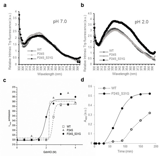 Another new γD-crystallin double mutant (P24S/S31G) was identified in cataract lenses (Table 1). Since single P24S mutant has already been studied in the cataract aggregate-likely mutant [20,21], we compared the double mutant (P24S/S31G) with WT and single one (P24S). To determine whether single and double mutants have different structural properties, we measured the intrinsic fluorescence of Trp of WT and single and double mutants. Since γD-crystallin is known to undergo conformational changes at acidic pH (pH 2.0) [37], we measured intrinsic fluorescence of Trp at pH 7.0 and 2.0. As shown in Figure 4a, no fluorescence difference between WT and two mutants was detected at pH 7.0, which is consistent with previous result [37]. However, intrinsic fluorescence of Trp of double mutant was significantly higher than those of WT and P24S single mutant at pH 2.0 (Figure 4b). The maximum emission wavelengths of intrinsic Trp fluorescence (λmax) was 338 nm for WT, while 4 nm red-shift for double mutant was observed. The intensity of intrinsic Trp fluorescence was also 1.3 times higher for the double mutant than WT. These results indicate that P24S/S31G double mutations of γD-crystallin alter conformational state and microenvironments more than P24S single mutation at the acidic pH. βB2-Crystallin is readily denatured at low concentrations of GdnHCl, while γD-crystallin is more resistant to denaturation by GdnHCl [16]. To investigate the stability differences between WT and the P24S and P24S/S31G mutants of γD-crystallin, we assessed intrinsic fluorescence changes by chemical denaturant GdnHCl (pH 7.4) in a dose dependent manner. As shown in Figure 4c, P24S/S31G mutant is more readily denatured at 2.0 M GdnHCl than WT and P24S mutant at 2.5 M.