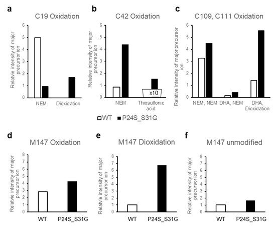 The structural changes of γD-crystallin in acidic condition cannot be examined with HDX-MS. Low pH is essential for pepsin digestion of protein for HDX-MS procedure. However, since γD-crystallin makes fibrils at low pH by aggregation [37], it is not possible to digest γD-crystallin aggregates at low pH with pepsin to examine the structural changes with HDX-MS. Therefore, we tried to determine the structural differences between WT and P24S/S31G mutant based on protein modifications, which vary depending on the structural states of the protein. We isolated WT and P24S/S31G mutant γD-crystallin recombinant proteins by SDS-PAGE and in gel-digestion with trypsin to obtain the peptides for analysis. We comprehensively analyzed the protein modifications of WT and P24S/S31G mutant γD-crystallin recombinant proteins employing peptide sequencing with nanoUPLC-ESI-q-TOF-MS/MS with SEMSA [39] which is a sensitive method for identifying low abundant modifications. Precursor ion chromatograms (XIC) of extracted precursor ions from both recombinant proteins are presented in Figure 6. All intensities of precursor ions were normalized by total ion chromatograms (TIC) of each sample run. Since protein modifications detected mainly in cataract lens are known as oxidation and deamidation [40,41], we assessed the protein modifications of WT and mutant γD-crystallins as shown in Table 2. Aging increases protein oxidation and cataract development is also promoted by oxidation of the lens [42,43]. Oxidations of Cys residues have been identified in cataract samples [42], and Met oxidation is known to be associated with cataractogenesis [44]. Of the six Cys residues of γD-crystallin, four Cys residues (Cys19, 42, 109 and 111) are predicted to be exposed to the surface of protein (Figure S7). Cys19 residue was not oxidized in WT, but was highly oxidized to sulfinic acid (16HYECSSDHPNLQPYLSR32, Δm = +32 Da) in P24S/S31G mutant (Figure 6a). Cys19 residue is present in the largest loop of the Greek key motif 1 where the mutation occurred. Therefore, the oxidation increase at Cys19 residue indicates the conformational change of Greek key motif 1 by mutation. Cys42 residue in double mutant was mainly not oxidized, but small faction of Cys42 was oxidized to thiosulfonic acid in double mutant (35SARVDSGCWMLYEQPNYSGLQYFLR59, Δm = +64 Da) (Figure 6b). Cys109 and Cys111 residues were detected in same tryptic peptide, and these are known to function as antioxidant by forming disulfide crosslinking in WT [45]. Cys109 residue was oxidized to dehydroalanine (Δm = −34 Da) and Cys111 was oxidized to sulfinic acid (Δm = +32 Da) in double mutant (Figure 6c). This indicates that Cys109-Cys111 disulfide formation does not work in the double mutant and lose their antioxidant function. In addition to Cys residue, Met residue is an oxidation sensitive amino acid. Met147 of γD-crystallin is known to be an important residue for protein solubility due to its proximity to the linker peptide and location at the interface between the N-terminal domain (NTD) and C-terminal domain (CTD) [46]. Met147 was also found to be more oxidized to mono- (143QYLLMPGDYR152, Δm = +16 Da), or di-oxidation (143QYLLMPGDYR152, Δm = +32 Da) in the double mutant, in particular the intensity of the double oxidation was found to be significantly increased compared to that of the unmodified peptide (Figure 6d–f). The results demonstrate that P24S/S31G double mutant is more readily oxidized than WT γD-crystallin. The results show that P24S/S31G mutant has different structure from WT γD-crystallin and is significantly aggregated in response to various stimuli causing cataract.