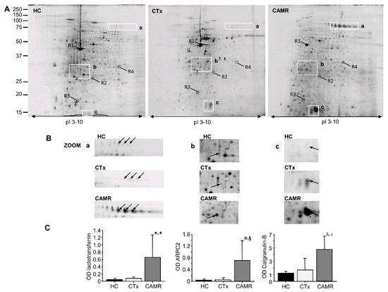 Differential protein spots analysis identified five protein spots with a significantly increased density in patients with chronic antibody-mediated rejection, compared to control transplant recipients and immunocompetent control subjects (fold change >2, Table 2). These spots corresponded to three proteins identified by mass spectrometry as lactotransferrin (Figure 1B,C, white box a in panel A), actin-related protein 2 (ARPC2) (Figure 1B,C, white box b in panel A) and calgranulin-B (Figure 1B,C, white box c in panel A) (Table 2).