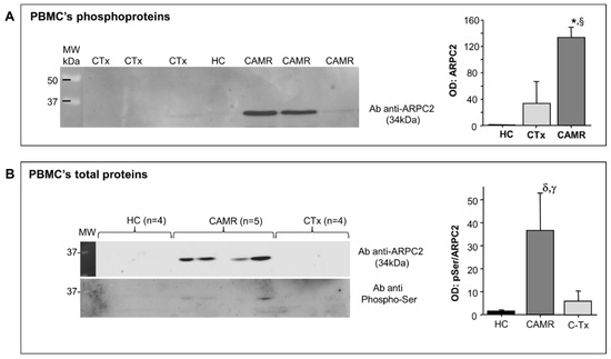 (A) A representative Western blot analysis of PBMCs’ phosphoproteins isolated from normal and pathological samples by lanthanum chloride. The statistically significant increase of ARPC2 in CAMR patients compared to CTx is highlight in the graphic at the right. Results are expressed as arbitrary units (OD: optical density) and normalized to the total amount of phosphoprotein loaded (*: p = 0.03 vs. CTx; §: p = 0.04 vs. HC). (Fisher’s PLSD for ANOVA test); (B) A representative Western blot of total PBMCs’ proteins extracted from HC, CAMR and CTx patients. Results are expressed as arbitrary units (OD: ratio between of optical density for anti-phosphoserine and optical density for anti-ARPC2) and normalized to the total amount of protein loaded. (δ: p = 0.04 vs. CTx; γ: p = 0.02 vs. HC). (Fisher’s PLSD for ANOVA test).