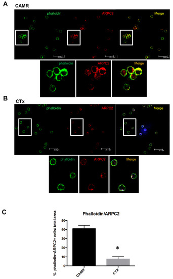 Confocal laser microscopy analysis of ARPC2 and F-Actin protein expression in PBMCs of CAMR patients (A) and a kidney transplant recipients with normal graft function (CTx) (B). Quantification of the percentage of falloidin and ARPC2 positive cells (C). * p < 0.05.