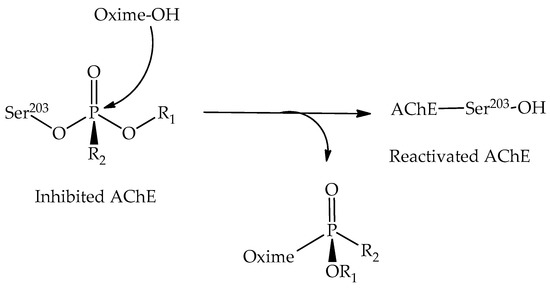 The current treatment protocol for OP poisoning consists mainly of the employment of a reactivating agent, commonly an oxime compound [13,14,15,16], which is capable of restoring the AChE catalytic activity through a nucleophilic attack, thus remediating the intoxication effects and reestablishing the ACh levels [17,18,19]. The general reactivation mechanism through oximes is represented in Figure 1.