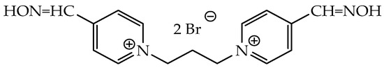 In view of what has been exposed so far, it is important to note that there is no universal antidote to date, that is, a broad-spectrum oxime capable of reactivating all types of OP-inhibited AChE. In recent years, efforts have focused on the screening and identification of potent oximes, with sufficient permeability through the blood–brain barrier (BBB), maintaining a high reactivation rate [19,20,21]. In this study, we present a theoretical and experimental investigation to better understand the reactivation mechanism of the AChE inhibited by several kinds of OP agents. Based on interaction and mechanistic studies, we seek to explain the experimental data through molecular modeling in order to comprehend the reactivation process, by employing trimedoxime as the reactivating species (Figure 2). We expect to understand the interaction modes and reactivity of trimedoxime in the reactivation process of the AChE–OP adduct.