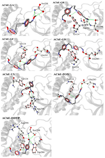 In most of the systems investigated, trimedoxime interacted with the Tyr124 amino acid residue, and according to the literature, this interaction is described as a possible π–π stacking, which takes place between Tyr124 residue and the pyridine ring of the oxime. This interaction is indicated as having an important role in helping transition state stabilization [2,24,25]. The hydrogen bonds revealed by the interaction of trimedoxime in each inhibited system are shown in Figure 4.