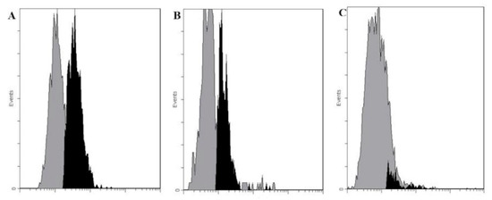 Interaction of human antibodies affinity-isolated using LeC-Sepharose with (A) HS758t cells, (B) ZR 75-1 cells and (C) SKBR-3 cells, flow cytometry data (Cytomics FC 500 Beckman Coulter). The concentration of anti-LeC antibodies was 5 µg/mL (1 µg per 106 cells). Cells detached from a monolayer were immediately analyzed using flow cytometry: the gray zone, control (no anti-LeC Abs); the black zone, binding of anti-LeC Abs to cells. The results of flow cytometry data were processed using the CXP Analysis 2.2 software. (A) gray zone, mean fluorescence intensity (MFI) 1.2; black zone, MFI 4.3, 66% of positive cells; (B) gray zone, MFI 0.53; black zone, MFI 1.4, 68% of positive cells; (C) gray zone, MFI 5.39; black zone, MFI 9.05, 7%, that is, practically no positive cells.