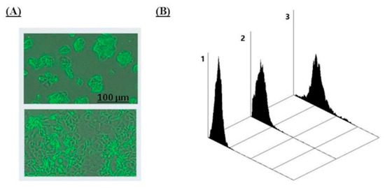 (A) Morphology of ZR 75-1 cells grown to 50% (top) and 85% (bottom) monolayer density. (B) Interaction of human antibodies affinity-isolated using LeC-Sepharose with ZR 75-1 cells, flow cytometry data (Cytomics FC 500 Beckman Coulter). The concentration of anti-LeC antibodies was 5 µg/mL (1 µg per 106 cells). Cells detached from a monolayer were immediately analyzed using flow cytometry: zone 1, control (no anti-LeC Abs, MFI 0.31); zone 2, binding of anti-LeC Abs to cells of grown to a density of 50% (7% of cells are positive, MFI 0.34); zone 3, binding to cells grown to a density of 85% (81% of cells are positive, MFI 2.3).