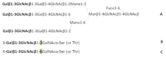 Does this mean that there are no other options for disposition of LeC as a terminal motif in natural glycoconjugates? The biosynthetic machinery of malignant cells produces rare, untypical chains based on the Galβ1-3GlcNAc backbone, such as the type 1 glycans Neu5Acα2-3Galβ1-3GlcNAc (in the CA-50 tumor marker) and Neu5Acα2-3(Fucα1-4)Galβ1-3GlcNAc (in the CA19.9 tumor marker) [14]. The elevated synthesis of CA-50 and CA19.9 is explained by a higher β-galactosyltransferase activity in the tumor cell, which, in turn, implies the ability of this enzyme to synthesize unknown tumor-associated glycans, in whose structure the Galβ1-3GlcNAc motif attached to a structure other than Galβ1-4GlcNAc. Here, it is necessary to cite data on the production of mouse Abs against the CA19.9 cancer glycoprotein—two hybridomas generated in that study resembled human natural Abs against LeC in terms of the specificity of IgM antibodies [10]. Because the biosynthetic machinery does not exclude the emergence of variants with the Galβ1-3GlcNAc disaccharide attached to the O-chains (Figure 4B–C), that is, to GalNAcα-Ser/Thr, we chemically synthesized the Galβ1-3GlcNAcβ1-3GalNAcα trisaccharide and added it to our PGA. The results of the analysis using this PGA were weakly positive. In contrast, the affinity of anti-LeC nAb for Galβ1-3GlcNAcβ1-6GalNAcα (a 1-6 isomeric trisaccharide, Figure 4C) was close to that of glycans from the above-mentioned LeC family—it turned out that this is the only structural motif potentially found in nature (in glycoprotein O-chains) capable of binding anti-LeC Abs. Therefore, we cannot exclude that Galβ1-3GlcNAcβ1-6GalNAcα or its elongated form X-Galβ1-3GlcNAcβ1-6GalNAcα (X is Neu5Ac or an oligosaccharide) is the actual target for cancer-associated anti-LeC antibodies or a key constituent of a more sophisticated antigen (see below).