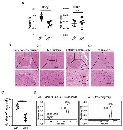 To investigate the brain toxicity of AFB1, 25-day-old male Kunming mice were administered intragastrically with 300 μg/kg.bw/day of AFB1 for 30 days. Total body weight and AFB1 concentration, histomorphology, and weight of the brain were then analysed. The results showed that the total body weight of mice was significantly lower in the AFB1-treated group, while the brain weight was not significantly affected (Figure 1A). However, pathological analysis of brain sections showed that the edges between the anterior commissure and surrounding organisations were not clear in the AFB1-treated group (Figure 1B). The number of large cells in the red nucleus was reduced and red-cell infiltration was evident in the brain, as indicated by the black arrow (Figure 1B,C). HPLC analysis showed that AFB1 accumulated in the brains of mice at approximately 60 μg/kg after AFB1 treatment, while no AFBO was detected (Figure 1D). Altogether, AFB1, but not AFBO, caused severe brain damage in mice.