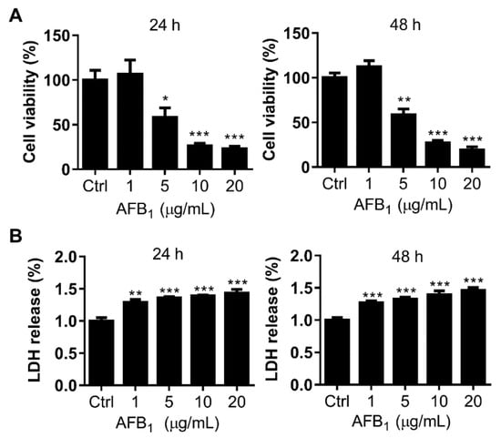 AFB1 exhibits significant cytotoxicity toward IMR-32 cells. (A) The IC50 values of AFB1 were 6.18 μg/mL and 5.87 μg/mL in IMR-32 cells after 24 h and 48 h of treatment, respectively. (B) Relative LDH release by IMR-32 cells exposed to different concentrations of AFB1 for 24 h and 48 h. All experiments were repeated three times and the values represent the mean ± SD of three independent experiments. Statistical significance was defined as * p < 0.05, ** p < 0.01, or *** p < 0.001.