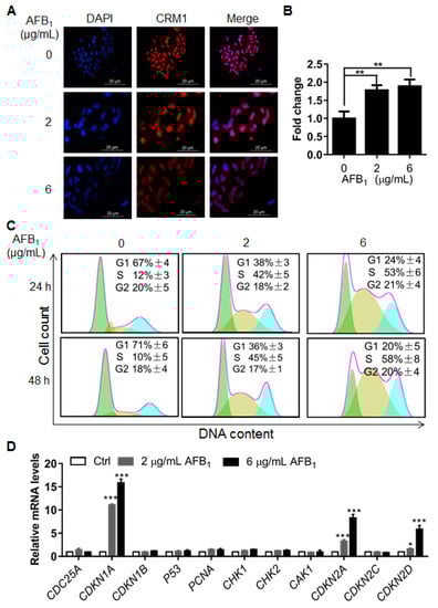 To further investigate the cellular damage caused by AFB1, nuclear size was determined by immunofluorescence using an antibody (anti-CRM1) against the nuclear membrane and DAPI staining. Interestingly, nuclear size increased significantly after treatment with 2 and 6 μg/mL of AFB1 (Figure 5A,B), indicating that AFB1 might induce other abnormalities in DNA, e.g., polyploidy. Next, the cell cycle of IMR-32 cells under treatment with AFB1 was analyzed by flow cytometry. The results showed that AFB1 induced significant S-phase arrest at concentrations of 2 µg/mL and 6 μg/mL after treatment for 24 h or 48 h (Figure 5C). To further investigate the mechanism of AFB1-induced S-phase arrest, the mRNA levels of cell cycle-related genes of IMR-32 cells after AFB1 treatment were analyzed by qRT-PCR. The results showed that the mRNA levels of CDKN1A, CDKN2C and CDKN2D were upregulated by 10.81-, 3.32-, and 1.61-fold after treatment with 2 μg/mL AFB1 for 24 h. At 6 μg/mL AFB1 treatment, the mRNA levels of CDKN1A, CDKN2C and CDKN2D were upregulated by 15.83-, 8.31-, and 5.86-fold, respectively (Figure 5D). Altogether, these results show that AFB1 significantly increased nuclear size and induced significant S-phase cell cycle arrest in IMR-32 cells, which was associated with the upregulation of CDKN1A, CDKN2C and CDKN2D.