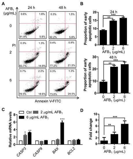 To determine the proportion of apoptotic cells using an Annexin V-FITC/PI kit (BD, Franklin Lakes, NJ, USA), the cells were first seeded in 6-well cell culture plates then harvested after treatment with AFB1 for 24 h or 48 h. The culture medium was discarded and the cells were digested with 0.25% trypsin and washed twice with precooled PBS. Next, the cells were resuspended in 1× binding buffer and 100 μL of cell solution was transferred to a new tube. Five microliters each of the Annexin V-FITC and PI solutions were added to each cell solution. The cells were gently vortexed and incubated for 15 min at 25 °C in the dark, and 400 μL of 1× binding buffer was added to each sample. Apoptosis was measured via flow cytometry (BD, Franklin Lakes, NJ, USA).