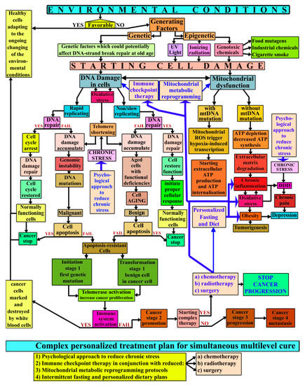 Epigenetic factors that lead to DNA damage include environmental agents, such as UV light, ionizing radiation, and genotoxic chemicals that are known to be carcinogenic. However, the majority of known cancer types develop because cell replication is affected directly by the telomere length, which is maintained by the telomerase enzyme abnormal activity. Telomere length and telomerase activities are essential factors for tumor survival and carcinogenesis [20,21,22]. There is strong scientific evidence for the link between emotional stress, telomere length, chronic inflammations, alterations of mitochondrial DNA, and environmental factors [23,24,25,26,27,28,29,30,31,32,33,34,35,36]. Chronic inflammation can cause oxidative DNA damage and is one of the leading causes of obesity. Obesity can lead to cancer [37,38,39,40,41,42,43,44,45,46,47,48].