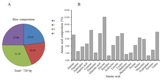 Sequence compositions of Hdh IGFBP7 CDs region at the nucleotide and amino acid levels. (A) Base composition, (B) Amino acid composition.
