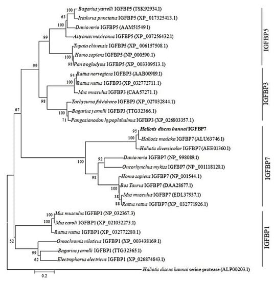 A phylogenetic tree was constructed with IGFBPs of various species to evaluate their evolutionary relationships. Phylogenetic analysis showed that Hdh IGFBP7 was placed within the IGFBP7 family and phylogenetically clustered with IGFBP7 of H. madaka belonging to the family of haliotidae. The sequence similarity, domain conservation, and phylogenetic analysis results indicated that this gene is a potential member of the IGFBP family.