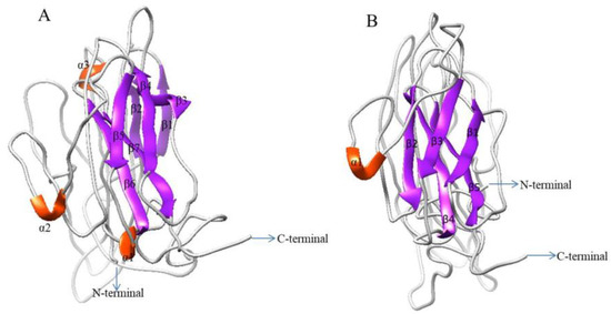 Comparison of 3D structure of IGFBP7 from (A) H. discus hannai and (B) H. madaka. N- and C- termini are marked with arrows. The structure was generated using I-TASSER server with a C-score between 2 and 4.