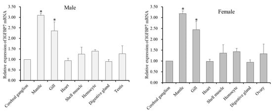Results revealed that Hdh IGFBP7 mRNA was expressed in all examined tissues. Hdh IGFBP7 mRNA levels were higher in female than in male. In male, the highest expression level of Hdh IGFBP7 mRNA was found in the mantle. It was significantly higher than that in the cerebral ganglion. Meanwhile, significantly higher expression (p < 0.05) level of Hdh IGFBP7 mRNA was detected in the gill compared to that in the cerebral ganglion. In female, Hdh IGFBP7 mRNA showed significantly higher expression in the mantle and gill than in other examined tissues.