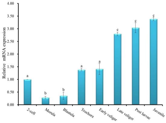 Relative expression levels of Hdh IGFBP7 mRNA in different developmental stages of H. discus hannai. Expression values of Hdh IGFBP7 mRNA were normalized to expression in the 2-cell stage (1). Means that do not share the same letter are significantly different.