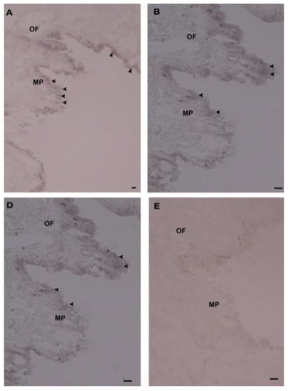 Detection of Hdh IGFBP7 mRNA in the mantle of H. discus hannai by in situ hybridization. (A) Strong hybridization signals with an antisense probe were found in the outer epithelium of mantle pallial (MP) edge, (B) Medium magnification of A, (D) High magnification showing hybridized Hdh IGFBP7 mRNA in mantle pallial (MP) edge, (E) No hybridization signals were observed in the control section stained with a sense probe. Strong hybridization signals are indicated with black arrowheads. Scale bar, 100 µm. OF, outer fold; MP, mantle pallial.