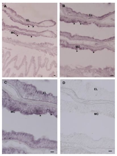 Hdh IGFBP7 mRNA detection in the gill of H. discus hannai by in situ hybridization. (A) Strong expression of Hdh IGFBP7 with an antisense probe was evident in mucus cells of the branchial epithelium, (B) Medium magnification of A; (C) High magnification showing hybridized Hdh IGFBP7 mRNA in mucus cells. (D) No hybridization signal was seen in the control section stained with a sense probe. Hybridization signals are indicated with black arrowheads. Scale bar, 100 µm. EL, epithelial layer; MC, mucus cells.