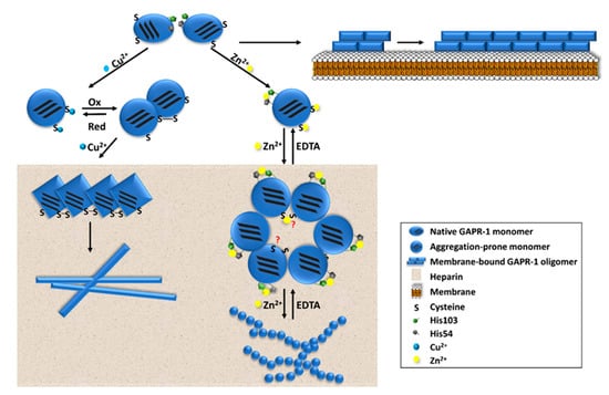 - Sheng, J.; Olrichs, N.K.; Geerts, W.J.; Kaloyanova, D.V.; Helms, J.B. Metal ions and redox balance regulate distinct amyloid-like aggregation pathways of GAPR-1. Sci. Rep. 2019, 9, 15048. [Google Scholar] [CrossRef]